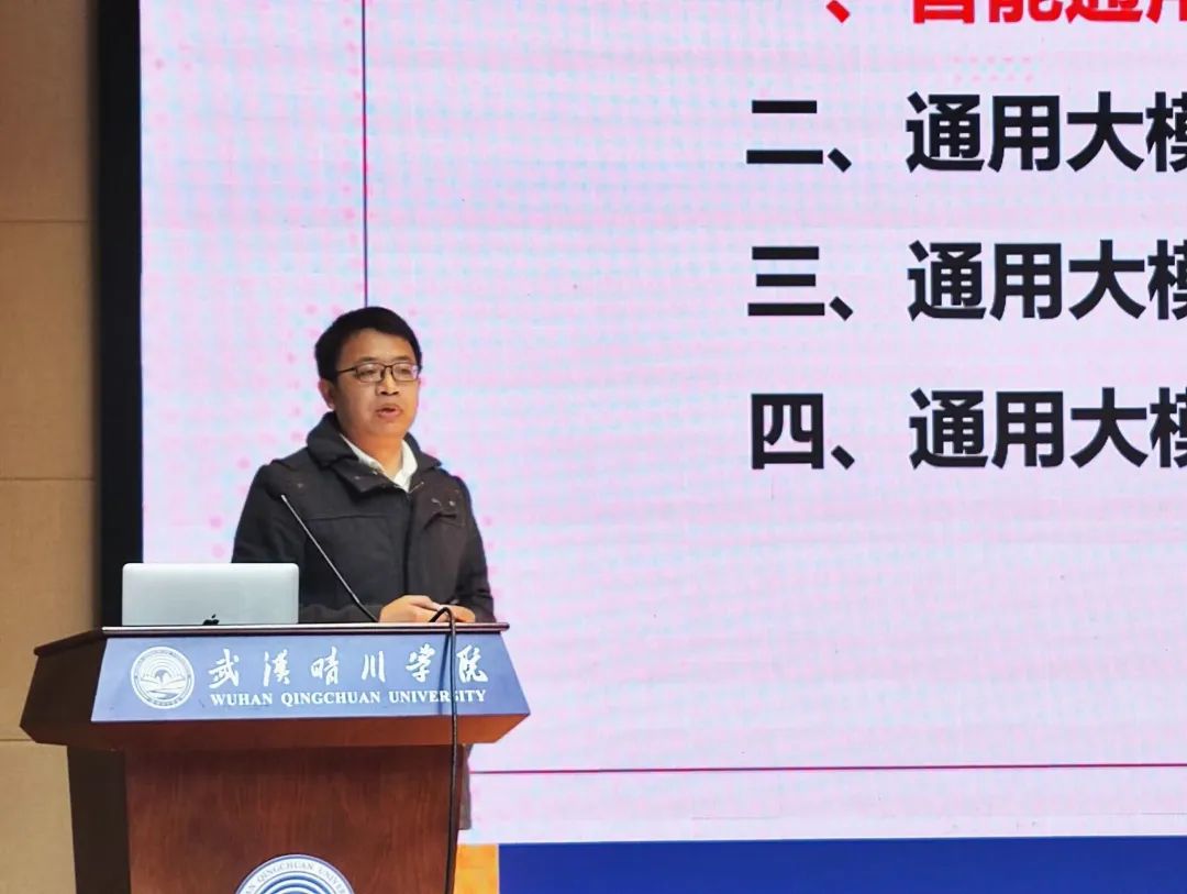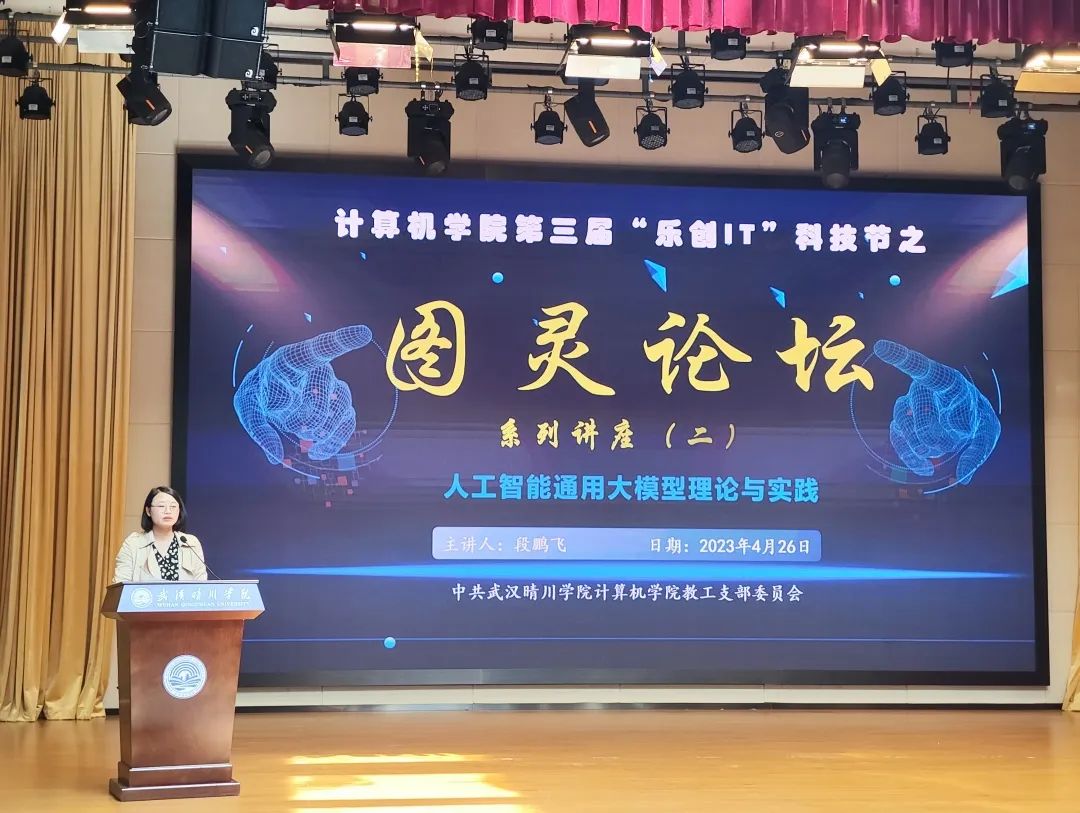 勇攀科技新高峰,踔厉奋发向未来。2023年4月26日下午,开云官方端网站登录入口第三届“乐创IT”科技节之图灵论坛系列讲座在晴川剧场拉开序幕。本次讲座有幸邀请到武汉理工大学计算机与人工智能学院副教授、硕士生导师段鹏飞教授,作主题为“人工智能通用大模型理论与实践”的学术讲座。出席本次讲座的领导有武汉晴川学院副校长向巍、开云官方端网站登录入口党总支书记岳逸飞、开云官方端网站登录入口副院长潘雪峰、院长助理裴浪和叶丽萍。开云官方端网站登录入口各系部主任和教师以及辅导员老师,400余名学生参与了本次活动。