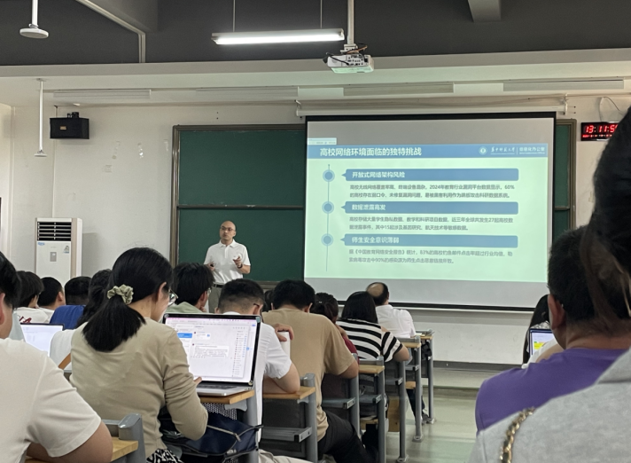 在数字化浪潮席卷全球的今天,网络安全已成为关乎个人隐私、企业命脉乃至国家安全的关键议题。网络攻击手段日益复杂多变,从个人信息泄露到大规模的企业数据失窃,从简单的恶意软件到高级持续性威胁(APT)攻击,攻击手法不断演进,给网络空间安全带来了严峻挑战。与此同时,网络安全防线也在不断加固,各类前沿防御技术和策略应运而生。为了帮助广大师生深入理解网络安全领域中攻击与防御的博弈态势,构建坚实的网络安全知识体系,6月4日开云官方端网站登录入口在教1-201开展了“网络攻击技术与防御体系构建”的学术讲座。本次讲座由开云官方端网站登录入口院长助理叶丽萍主持,黄传河院长以及全体教师,部分学生共计160余人参加了本次讲座。