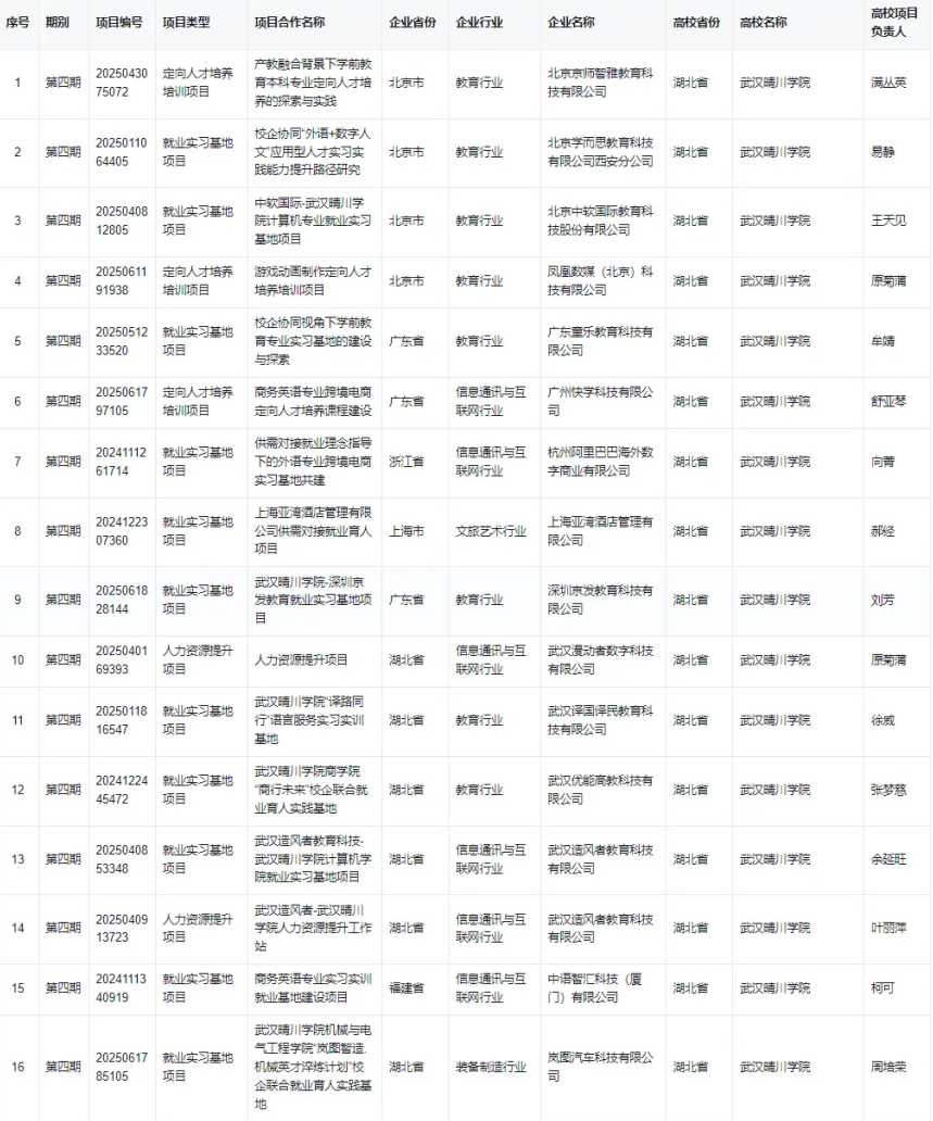 近日,教育部高校学生司正式公布了第四期供需对接就业育人项目立项名单。武汉晴川学院申报工作成果丰硕,共有16个项目成功获批立项。这些项目涉及就业实习基地建设、定向人才培养与培训、人力资源提升等多个领域,覆盖信息通讯与互联网、装备制造、教育等多个行业。这一成绩不仅体现了学校在产教融合方面的持续努力,也展示了其在提升人才培养质量和促进学生高质量就业上所取得的显著成效。