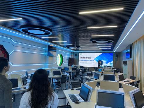 武汉东湖学院计算机科学学院网络空间安全学院,共有数字逻辑、人工智能、大数据分析、网络工程、网络攻防、软件工程、物联网工程、数字媒体技术等15个专业实验室和5个通用机房,丰富的教学资源保障了该院实践教学的高速运行,为提高学生的实践能力和就业率奠定了坚实的基础。在调研中,学院老师参观了大数据·人工智能智慧创新工场、互联网+大学生创新创业基地、东软软件工程实训室等。其专业实验室设备先进、装修美观、布局合理、管理规范,为学生提供了良好了实验环境。在参观过程中,东湖学院网络空间安全学院院长赵莉,向我们详细地介绍了实验室的功能、设备参数、布局装修思路、承担课程、管理制度及与企业合作等情况,学院老师对大数据·人工智能智慧创新工场建设进行了详细地询问和交流。