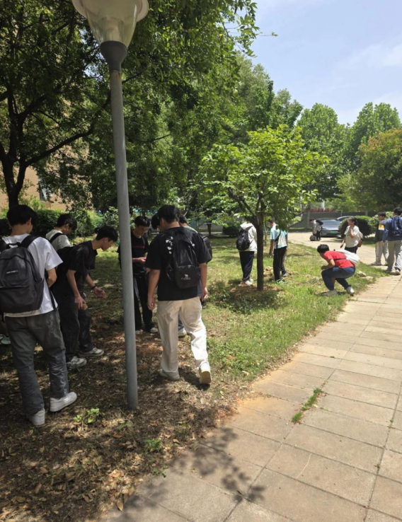 烈日下,同学们的身影穿梭在绿植与步道之间。有人用树枝拨开密集的草丛,找出藏匿的石块;有人半跪在地上,耐心抠出卡在缝隙中的碎石。过程中,大家互相提醒、默契配合,不时分享“寻石”小技巧,笑声随着一块块石头被清理而此起彼伏,劳动氛围轻松热烈。