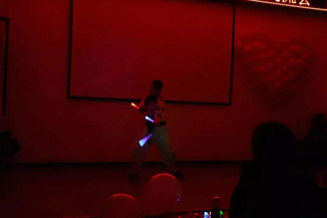接下来,大家眼前一亮,是“李小龙”带来的双截棍表演,双截棍在黑暗中显得十分耀眼,随着男生刚韧有力的双手在空中划出一道道夺目的光彩。