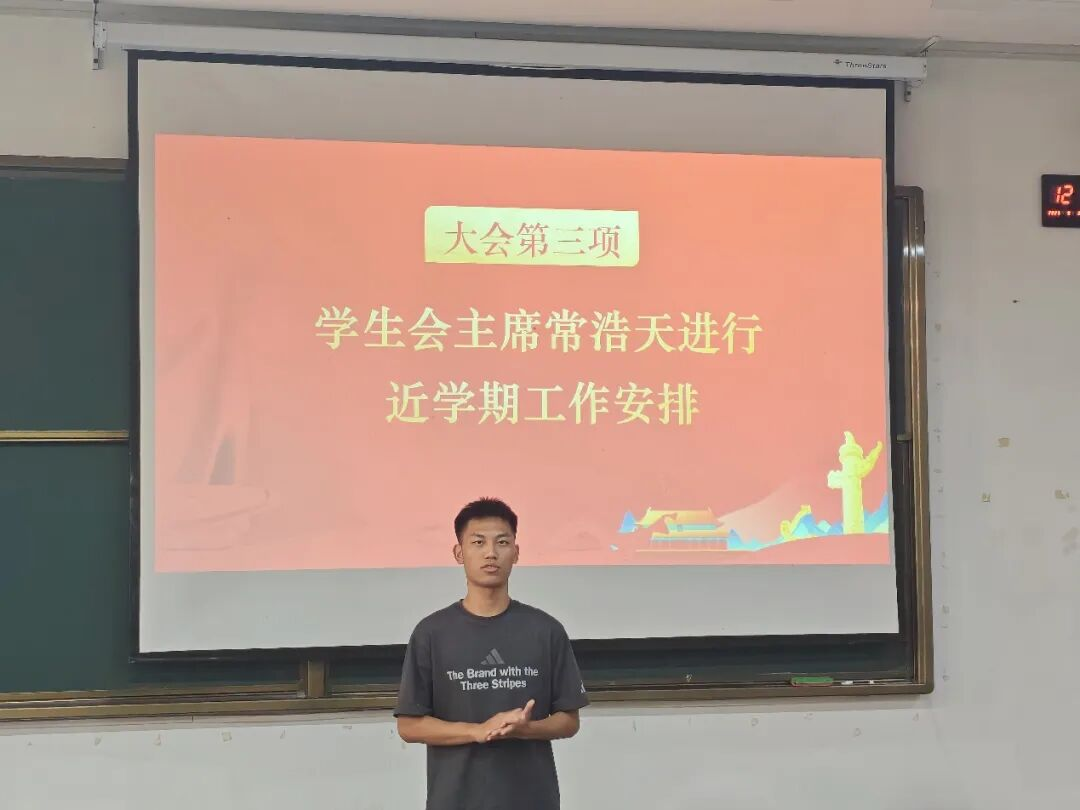 大会第三项,由学生会主席常浩天进行近学期工作安排。他在其中表明,在迎新工作上,需要大家协力完成;在新生军训期间,抓牢后勤保障;在招新会上,需要大家共同布置现场;在学代会上,鼓励大家积极参与主席团与部长的竞选。以及,希望大家,不怕苦难,保持耐心。