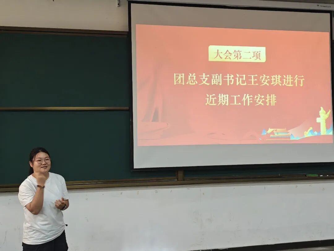 大会第二项,由团总支副书记王安琪进行近期工作安排。她在其中表明,对于教师节,希望大家踊跃表达想法;对于迎新,需要全体参与,共同做好准备;对于招新,希望大家多加宣传,展示良好形象;对于中秋,将再于外国语学院联动举办;对于国庆,将进行爱国主义教育宣传。以及希望大家,不怕苦不怕累,多多参与活动、积极成长。