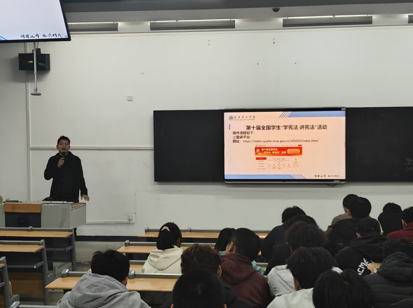 活动伊始,余延旺老师结合当前法治社会建设的时代背景,阐述了宪法作为国家根本大法的核心地位和重要意义。他指出,宪法不仅是治国安邦的总章程,更与大学生的学习生活息息相关,从学业深造、就业创业到个人权利保障,宪法精神贯穿始终,学好宪法是青年成长成才的重要基础。为避免理论学习的枯燥感,余老师特意选取了与大学生群体密切相关的宪法条文和典型案例,通过“案例解读+条文阐释”的方式,深入浅出地讲解了宪法中关于公民基本权利与义务、教育公平、网络安全等方面的内容,让抽象的法律知识变得通俗易懂。