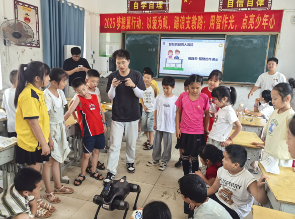 武汉晴川学院开云官方端网站登录入口党总支书记王天见重点阐述了强国行科技支教的核心内涵。他指出,教工支部以 “强国行” 专项行动为抓手,充分发挥党员教师在教学研究、科研管理方面的优势,将高校优质教育资源精准下沉至乡村。此次科技支教中,支部党员教师带领实践团携带机器狗、无人机等前沿智能设备走进小河口小学暑期托管班,通过现场操控演示 —— 机器狗完成人体跟随、舞蹈、俯卧撑等动作,无人机展示空中盘旋与航拍技巧,让孩子们近距离感受科技魅力,不少孩子像李晨跃、张子萱那样,对机器狗的优雅动作和跟随功能赞不绝口,眼中闪烁着对科学的向往。