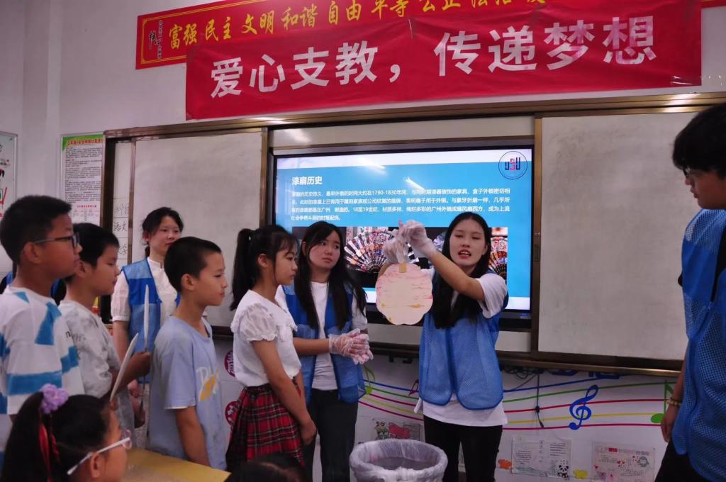 志愿者们首先为同学们准备了各种制作材料:精选的白扇、优质的五彩漆料等。接着,志愿者周蒙蒙和吴莎莎在课堂上详细讲解了漆扇制作的步骤和技巧: