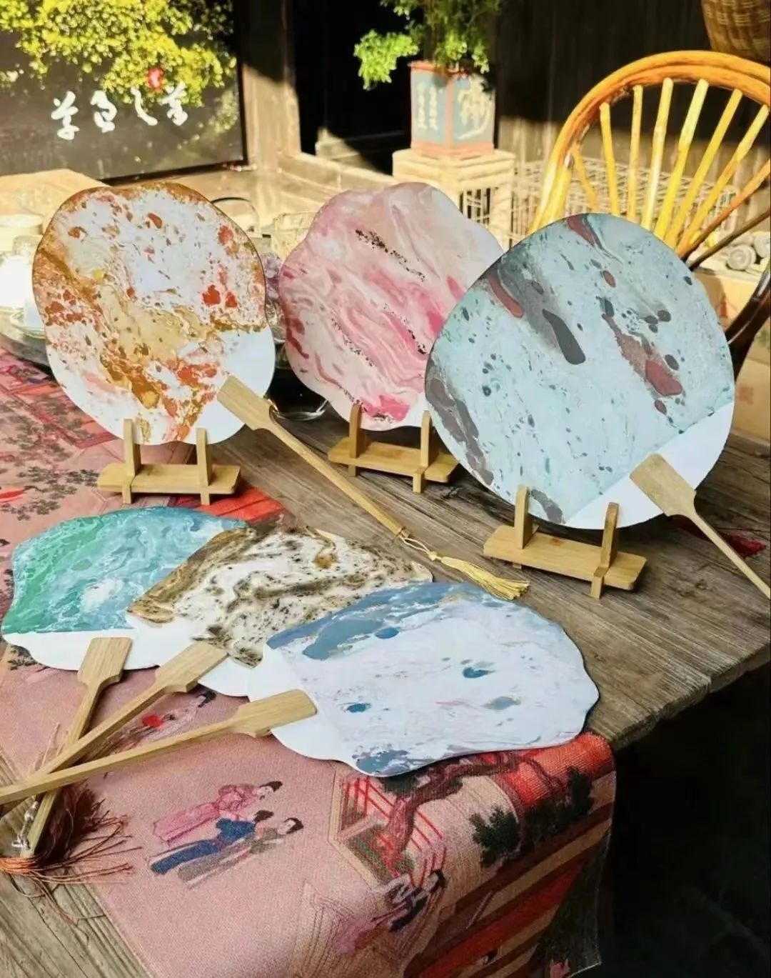 漆扇是一种利用漆不溶于水的特性,通过将团扇放入水中,以点、甩、弹、划等手法在水面绘出图案效果的技术。这种技术使得漆扇的图案效果自然天成,每一把漆扇都是独一无二的存在。以漆为笔,以水为墨,漆扇似一幅动态的山水画,融合古代文人的优雅气质又展现现代潮流的璀璨魅力。一入一出之间,韵味悠长。东方美学的神韵,在扇面上翩翩起舞。