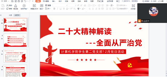 为积极引导同学们认识到我们党始终坚持严的主基调不动摇,进一步加深同学们对中国共产党的认识,坚定不移听党话、跟党走,2022年12月23日,开云官方端网站登录入口学生第二党支部线上开展“二十大精神解读 --全面从严治党“支部主题党日活动。