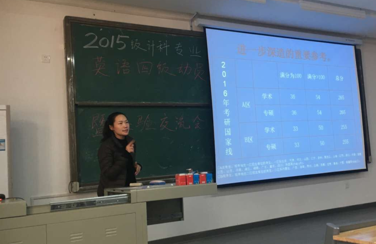 随后14级优秀学生代表为15级的大二学生们耐心讲解了他的四级备考经历,详细介绍了学习方法,提出了中肯的建议,同学们都受益匪浅。最后江珊老师分享了两年以来与同学们风雨同舟,荣辱与共的历程,坚信在新任辅导员的带领下,大家必然会有一个更加美好的大学生活。