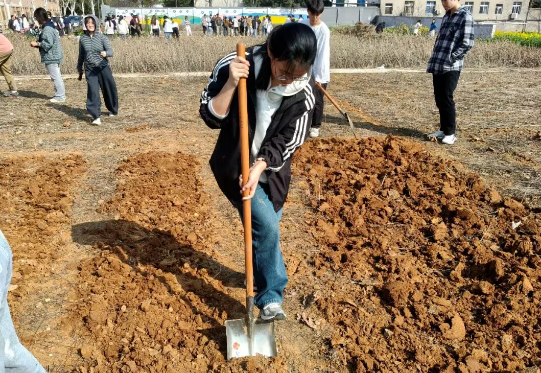 活动现场,泥土的芬芳与青春的活力交织。余老师铲下第一铲,将板结的泥土翻作松软的“温床”。